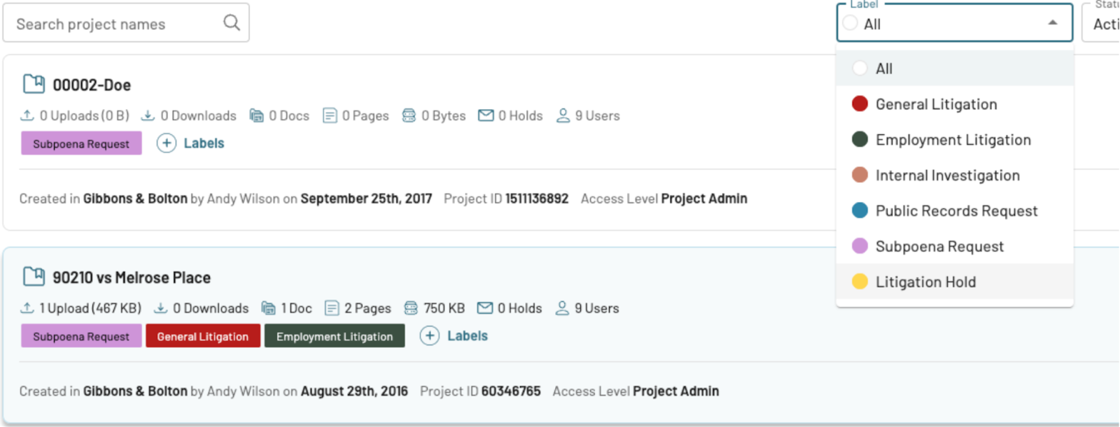 You can now add labels to your projects based on different themes or criteria, such as “Internal Investigation” or “Subpoena Request.”